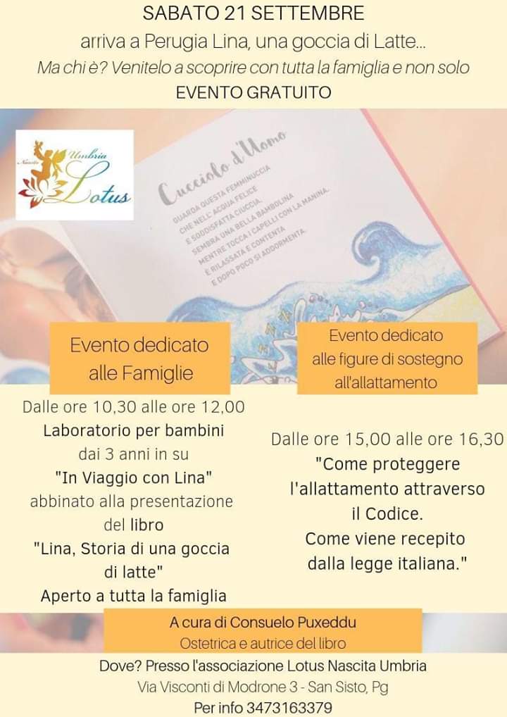 | ‘Lina, una goccia di latte…’ 21 Settembre 2019 Associazione Lotus Nascita Umbria Via Visconti di Modrone, 3 – San Sisto – Perugia | Locandina |